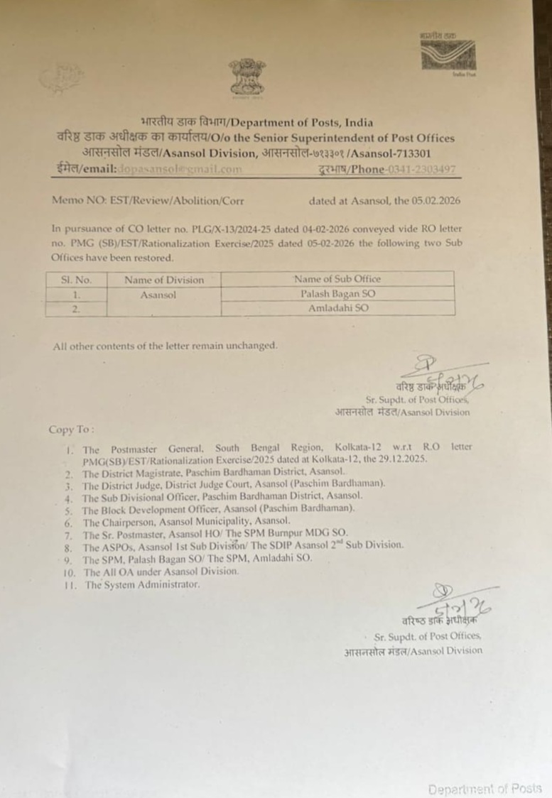 ফিরে এলো আমলাদহি পোস্ট অফিস। ধারাবাহিক আন্দোলন, প্রশাসনিক স্তরে নিবিড় তদ্বির এবং ক্রমাগত প্রচারের সুফল ফললো। আমলাদহি উপ ডাকঘরের আর স্থানান্তরিত হওয়া হলো না, রয়ে গেল পুরনো অবস্থানেই। মানুষের দাবিকে সরকার মান্যতা দিল, পোস্ট অফিসটির এখানে বিশেষ প্রয়োজনও ছিল বলে উল্লেখ করলেন আসানসোল ডিভিশনের সিনিয়র সুপারিনটেনডেন্ট অফ পোস্ট অফিসেস দেবরাজ শেঠি। মানবিক এই পদক্ষেপের জন্য সংশ্লিষ্ট সকল পক্ষের তরফ থেকে শ্রী শেঠিকে ধন্যবাদ জানান হিউম্যান রাইটসের কর্মকর্তা গৌরাঙ্গ ঘোষ। বিষয়টি নিয়ে অত্যন্ত সন্তোষ প্রকাশ করেছেন সিএলডব্লু লেবার ইউনিয়নের সাধারণ সম্পাদক রাজীব গুপ্ত। তিনি বলেন তাদের লড়াই আন্দোলনের জয় হল। অসুবিধার হাত থেকে রেহাই পেলেন বহু মানুষ। আজ ৫ ফেব্রুয়ারি এস এস পি'র জারি করা বিজ্ঞপ্তিতে (নং ইএসটি/ রিভিউ/এ্যবোলিশন/কারেকশন, তারিখ ৫/২/২০২৬) উল্লেখ করা হয়েছে পোস্টমাস্টার জেনারেলের সম্মতির ভিত্তিতে আসানসোল ডিভিশনের দুটি পোস্ট অফিসের স্থানান্তরের নির্দেশ স্থগিত করা হচ্ছে। সেগুলি হল পলাশবাগান সাব পোস্ট অফিস এবং আমলাদহি সাব পোস্ট অফিস। এর ফলে আমলাদহি পোস্ট অফিসটিকে চিত্তরঞ্জন প্রধান পোস্ট অফিসের সঙ্গে মিশিয়ে দেওয়ার যে প্রক্রিয়া চূড়ান্ত হয়ে গিয়েছিল সেটি স্থগিত হলো। পুনরায় আমলাদহি এলাকার ২২ নম্বর রাস্তার রেল আবাসনেই সুদীর্ঘকাল ধরে থাকা পোস্ট অফিসের কাজ আগের মতোই চলবে।