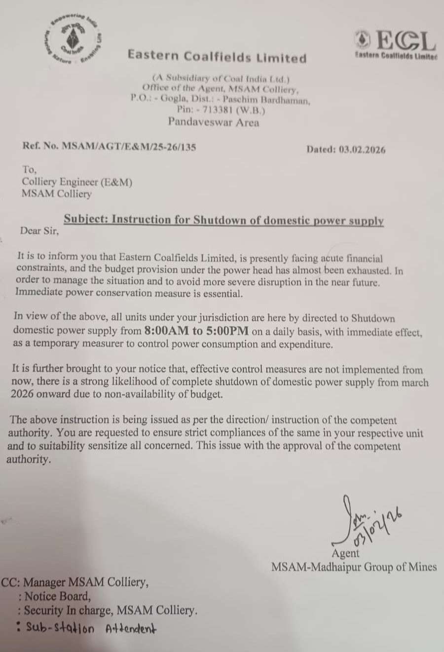 আর্থিক পরিস্থিতির দোহাই দিয়ে সকাল আটটা থেকে বিকেল পাঁচটা পর্যন্ত বিদ্যুৎ সরবরাহ বন্ধ রাখার নির্দেশ জারি করেছে ইসিএল। ইসিএল-এর আবাসিক এলাকায় প্রতিদিন বিদ্যুৎ সরবরাহ এর ফলে ৯ ঘন্টা বন্ধ হয়ে যাবে। বিকট এই পরিস্থিতির শিকার মাধ্যমিক এবং উচ্চমাধ্যমিক পরীক্ষার্থীরা। একই সঙ্গে বয়স্ক মানুষ এবং অসুস্থ ব্যক্তিরাও দিনের মুখ্য সময়ে ৯ ঘন্টা বিদ্যুৎ না থাকার অসুবিধায় পড়বেন। বিশেষ করে রেফ্রিজারেটর এবং অন্যান্য সরঞ্জাম কার্যকরী না থাকার সম্ভাবনায় উদ্বেগে পড়েছেন মানুষজন। ই সি এল সাতগ্রাম এরিয়ার জারি করা এই বিজ্ঞপ্তির ফলে ব্যাপক প্রতিক্রিয়ার সৃষ্টি হয়েছে সমগ্র খনি এলাকায়। ওই বিজ্ঞপ্তিতে বলা হয়েছে ৩ ফেব্রুয়ারি থেকে 'ডোমেস্টিক পাওয়ার সাপ্লাই' সকাল আটটা থেকে বিকেল পাঁচটা পর্যন্ত শাটডাউন করা হচ্ছে। কারণ বিদ্যুৎ খাতে টাকার অভাব। আরো বলা হয়েছে অবিলম্বে এই ব্যবস্থা এখনই কার্যকরী না করা হলে মার্চ মাস থেকে ডোমেস্টিক পাওয়ার সাপ্লাই সম্পূর্ণরূপে বন্ধ হয়ে যাওয়ার চরম আশঙ্কা আছে। কিন্তু এই পরিস্থিতির সৃষ্টি কেন হলো তাই নিয়ে বিভিন্ন মহলে বিভিন্ন রকম কথাবার্তা শুরু হয়েছে। অনেকেই বলছেন যে, সরকারি হাতে খনিগুলিকে তুলে দেওয়ার যে প্রক্রিয়া শুরু করেছে ইসিএল এটা তারই কুফল। কেউ কেউ বলছেন ইসিএল কর্পোরেট সোশ্যাল রেস্পন্সিবিলিটি বা সামাজিক দায়বদ্ধতা খাতে যে অর্থ রেখেছে এখন আপৎকালীন পরিস্থিতিতে সেই অর্থ ব্যয় করে বিদ্যুৎ সরবরাহ জারি রাখুক। তাহলে পরীক্ষার মুখে হাজার হাজার পড়ুয়ার ভবিষ্যৎ অন্ধকারাচ্ছন্ন হবে না।@প্রান্তভূমি
