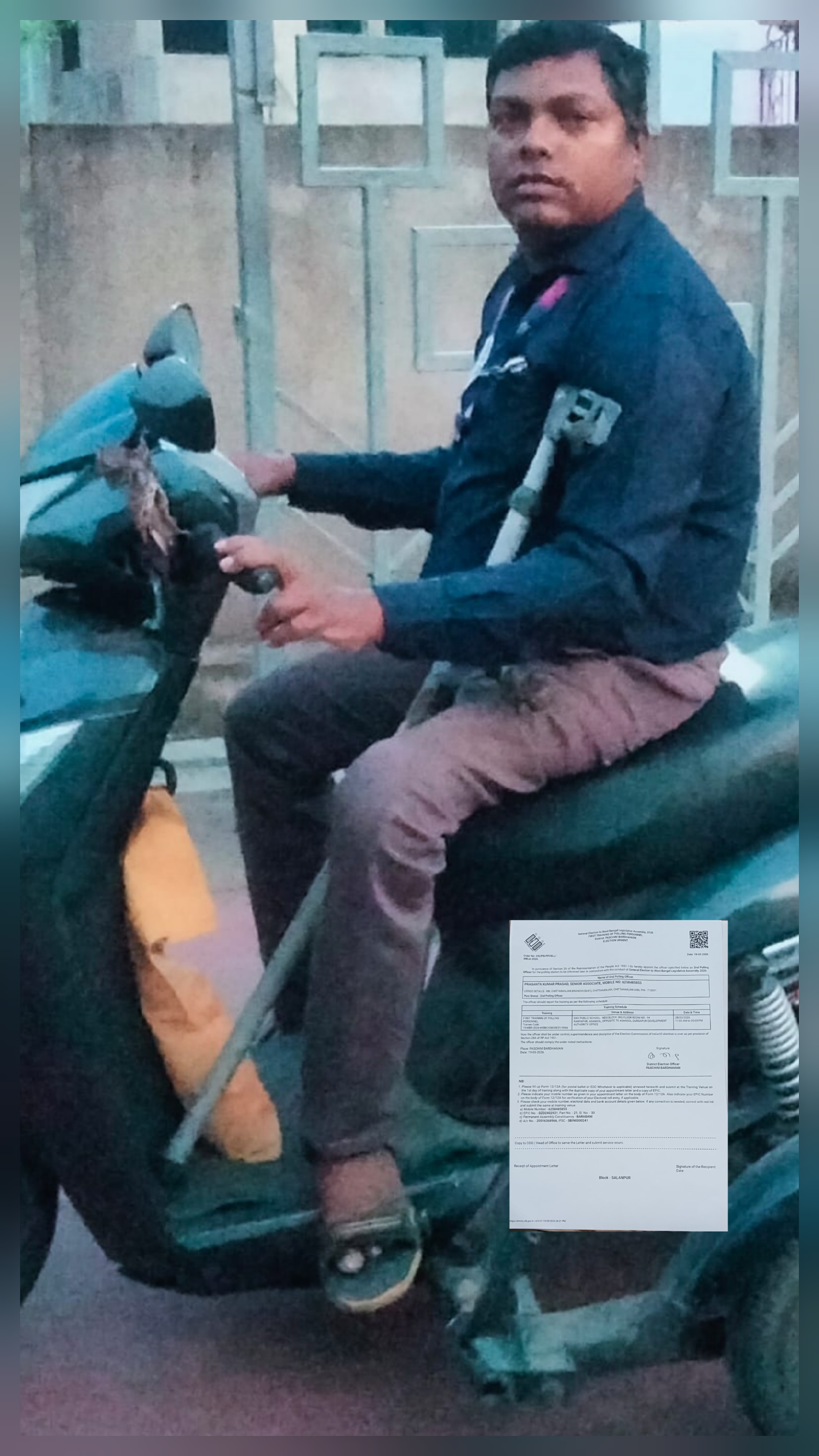 প্রা:প্র:: ডিউটিতে যাওয়ার সময় বিশেষ ধরনের স্কুটারে তাকে বসিয়ে দেন তার স্ত্রী, চাকরিস্থলে পৌঁছালে সহকর্মীরা তাকে ধরাধরি করে নামিয়ে কাউন্টারে বসিয়ে দেন। অসুবিধার জন্য কাজের মাঝে একবারই তিনি শৌচালয়ে যান তাও সহকর্মীদের সহায়তায়। ডিউটি শেষে আবার সহকর্মীরাই ওই বিশেষ ধরনের স্কুটারে তাকে চাপিয়ে দেন। বাড়িতে নামিয়ে নেন স্ত্রী। বাড়িতেও বাথরুম হাঁটাচলা সবকিছুই করতে হয় বগলে ক্র্যাচ এবং স্ত্রীর সাহায্য নিয়ে। পোলিও আক্রান্ত হওয়ায় তার শরীরের নিম্নাংশ অচল। সরকারি শংসাপত্রে উল্লেখ আছে ৫০ শতাংশ প্রতিবন্ধকতার। তবু এহেন ব্যক্তিকেও ভোটের ডিউটির চিঠি পাঠিয়ে প্রশিক্ষণে যাওয়ার নির্দেশ দেওয়া হয়েছে। ফলে চরম আতান্তরে পড়েছেন চিত্তরঞ্জন স্টেট ব্যাংকের কর্মী সিনিয়র অ্যাসিস্ট্যান্ট প্রশান্ত কুমার প্রসাদ। রূপনারায়ণপুর সুকান্ত পল্লীর বাসিন্দা প্রশান্ত বাবু ব্যাংকের ডিউটি কোনক্রমে রক্ষা করে চলেছেন। কিন্তু বারবার তাকেই ভোটের ডিউটিতে পাঠানোর এত্তেলা আসায় বিস্মিত তার সহকর্মীরাও। এবার বিধানসভা নির্বাচনে দ্বিতীয় পোলিং অফিসারের গরু দায়িত্ব দিয়ে তাকে ২৮ মার্চ আসানসোল ডিএভি স্কুলের প্রশিক্ষণ কেন্দ্রে যাওয়ার চিঠি পাঠানো হয়েছে ১৯ মার্চ। যার নম্বর ২৩২ / পি বি / পি পি সেল / ডব্লু বি এল এ ২০২৬ ট্রেনি কোড ১৯ মার্চ ২০২৬-৬৯ বি বি সি/ ৪৩ বি ৫০ ই ৩১/৯০৬৬।
