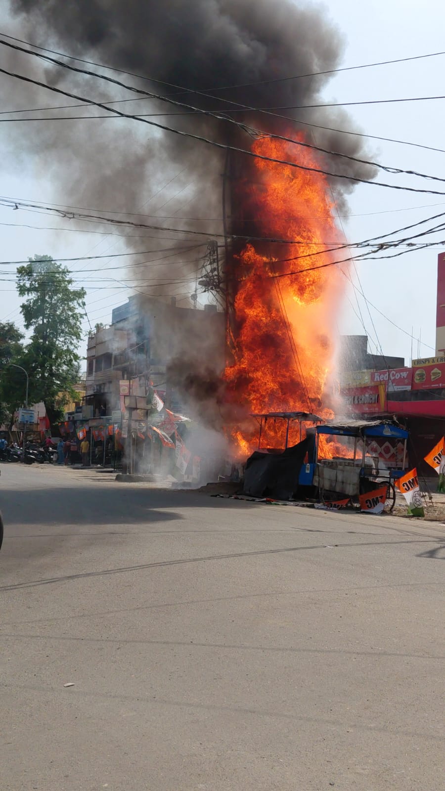 প্রা:প্র:: ভয়াবহ বিস্ফোরণে কেঁপে উঠল রূপনারায়ণপুর। ভরদুপুরে বীভৎস গরমের মধ্যেই হঠাৎ করে আগুন লেগে যায় রূপনারায়ণপুরের কেন্দ্রস্থল ডাবর মোড় বাসস্ট্যান্ডের ঠিক পাশে থাকা বৈদ্যুতিক ট্রান্সফরমারে। দাউ দাউ করে জ্বলতে থাকা সেই আগুন গ্রাস করে নেয় ট্রান্সফরমারের নিচে পাশে থাকা একাধিক অস্থায়ী খাবারের দোকানকে। কিছুক্ষণের মধ্যেই সেই সব দোকানের ভেতরে থাকা গ্যাস সিলিন্ডার প্রচন্ড শব্দে বিস্ফোরিত হয়। মারাত্মক আওয়াজে পথ চলতি মানুষজন গাড়ি থেকে পড়ে যান। এদিকে বেশ কয়েকদিন ধরেই এলাকায় বিদ্যুতের অব্যবস্থা চলছে। ঘনঘন কারেন্ট যাচ্ছে আসছে। বীভৎস গরমে মানুষ গলদ ধর্ম হচ্ছে। এই অবস্থায় রূপনারায়ণপুর বিদ্যুৎ অফিস থেকে কয়েক হাত দূরে ডাবর মোড়ের ট্রান্সফরমারে ভয়াবহ আগুন এবং বিস্ফোরণ এলাকায় মারাত্মক আতঙ্কের সৃষ্টি করেছে। তবে দুপুর প্রায় পৌনে দুটো নাগাদ এই আগুন লাগলেও আড়াইটার সময়ও আগুন নেভানোর কোন প্রশাসনিক উদ্যোগ দেখা না যাওয়াই স্থানীয় বাসিন্দারা এবং ব্যবসায়ীরা ক্ষোভ প্রকাশ করেছেন। জানা গেছে চিত্তরঞ্জন থেকে একটি দমকলের ইঞ্জিন ঘটনাস্থলের দিকে রওনা দিয়েছে। এলাকায় রূপনারায়ণপুর পুলিশের উপস্থিতি আছে। কিন্তু মারাত্মক এই গরমে রূপনারায়ণপুর এখন বিদ্যুৎহীন।@প্রান্তভূমি